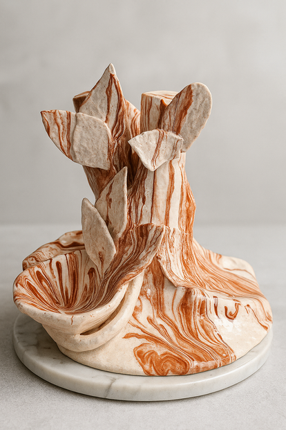 Une œuvre artisanale façonnée à la main en argile sans cuisson, peinte à l’acrylique marbrée blanc et brun, et protégée d’une résine brillante.