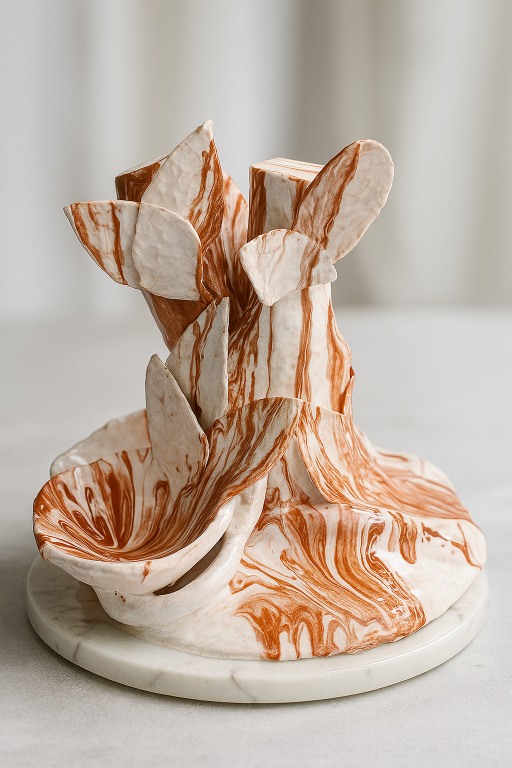 Une œuvre artisanale façonnée à la main en argile sans cuisson, peinte à l’acrylique marbrée blanc et brun, et protégée d’une résine brillante.